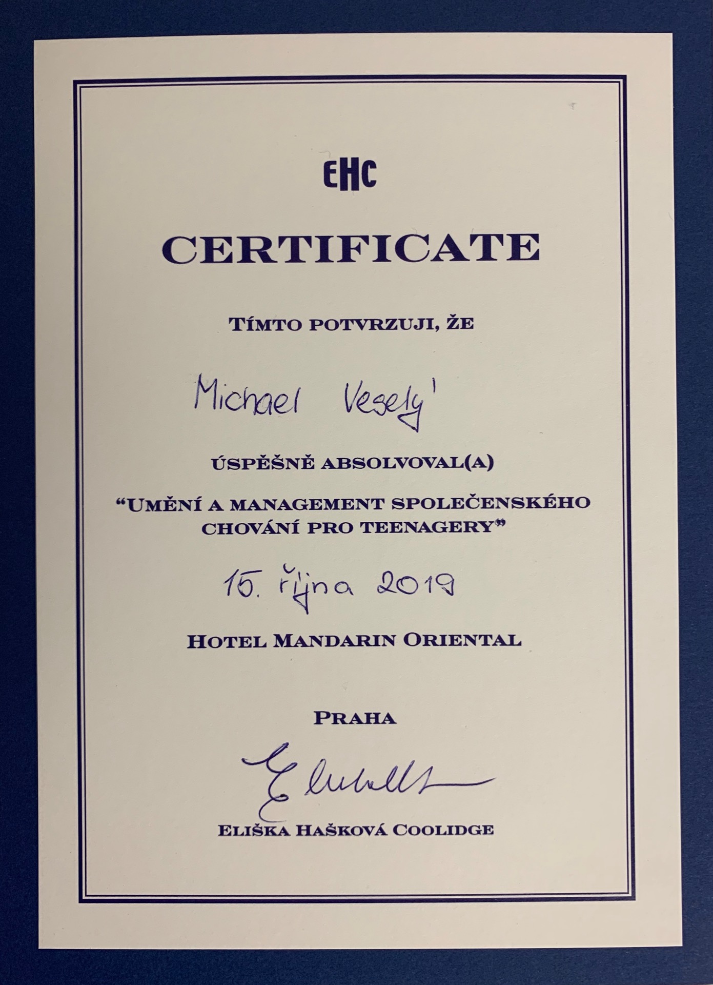 Chytil se i příležitosti zúčastnit se v pražském hotelu akce, kterou pořádala Eliška Hašková Coolidge (významná česká osobnost v oblasti etické výchovy). Odtud Michael získal certifikát "Umění a management společenského chování pro teenagery."